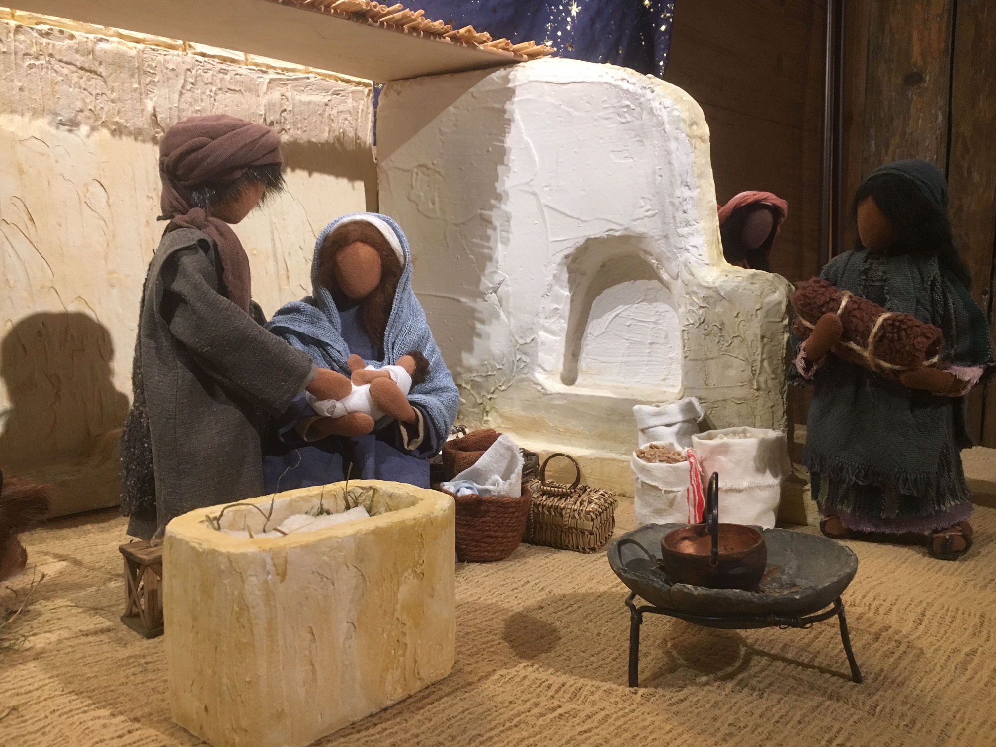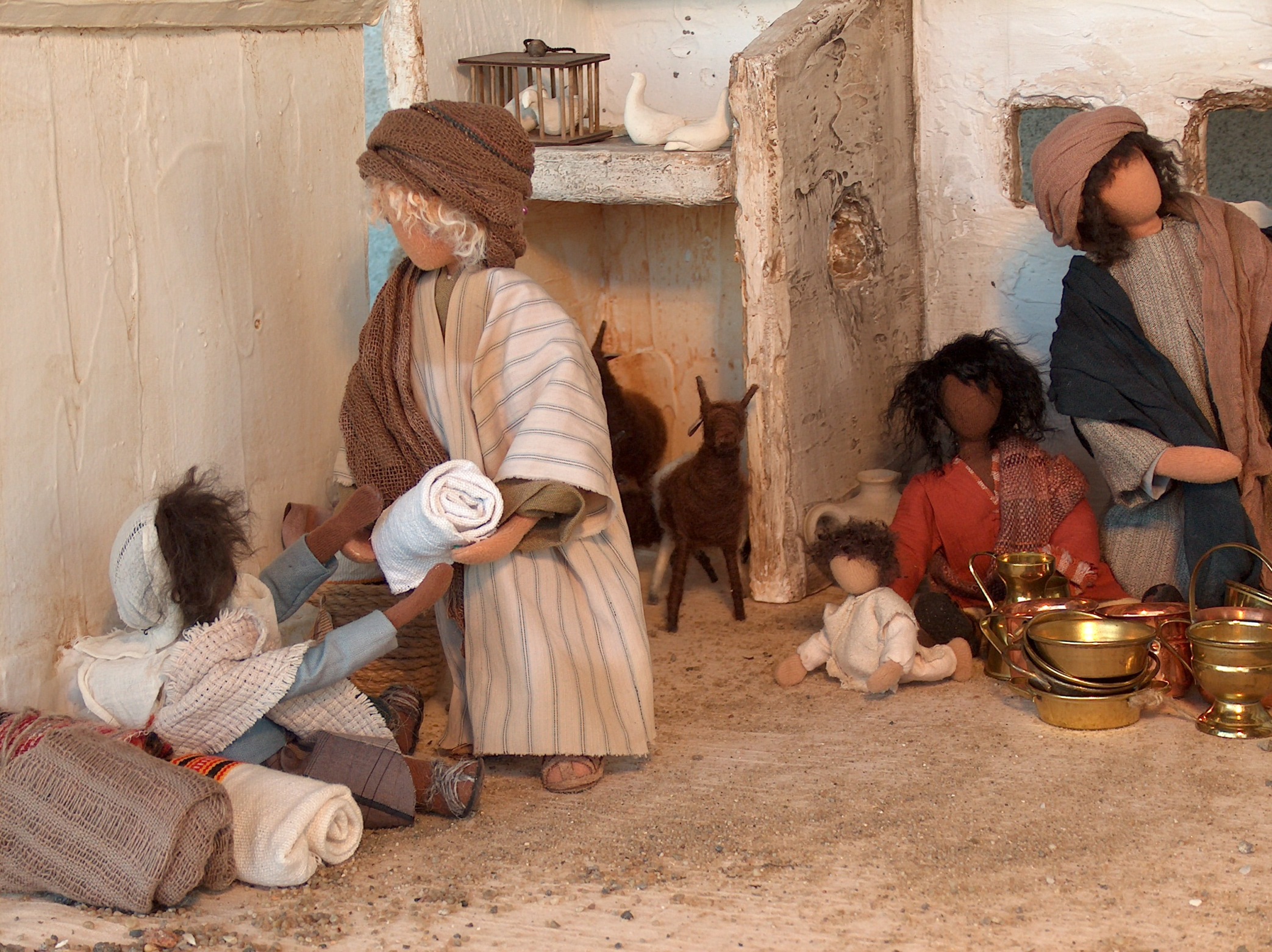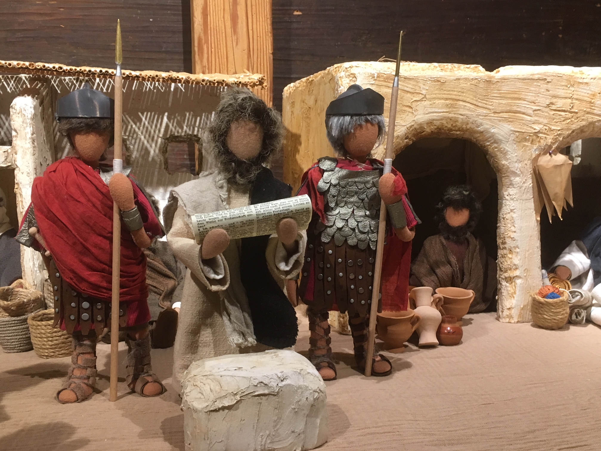 Trotz gestalterischer Schlichtheit hat jede der Bibelfiguren ihre eigene Ausstrahlung. Und durch die Beweglichkeit der Körper (Sisaldraht-Gestell) wirken die Figuren sehr lebendig. Während jahrelanger Kurstätigkeit mit Frauen in verschiedenen Gemeinden entstanden immer wieder neue Bibelfiguren. Auch helle Häuserkulissen und Beduinenzelte wurden nach orientalischen Modellen nachgearbeitet. Zubehör wie Palmen, Wüstenbrunnen, Handmühlen, Tontöpfe und Korbwaren usw. schmücken die Szenen. Natürlich sind für die Kinder die vielen Schafe, Ziegen, Esel und Kamele eine besondere Attraktion. Und die römischen Soldaten mit Speer und Schwert lassen Bubenherzen höherschlagen.