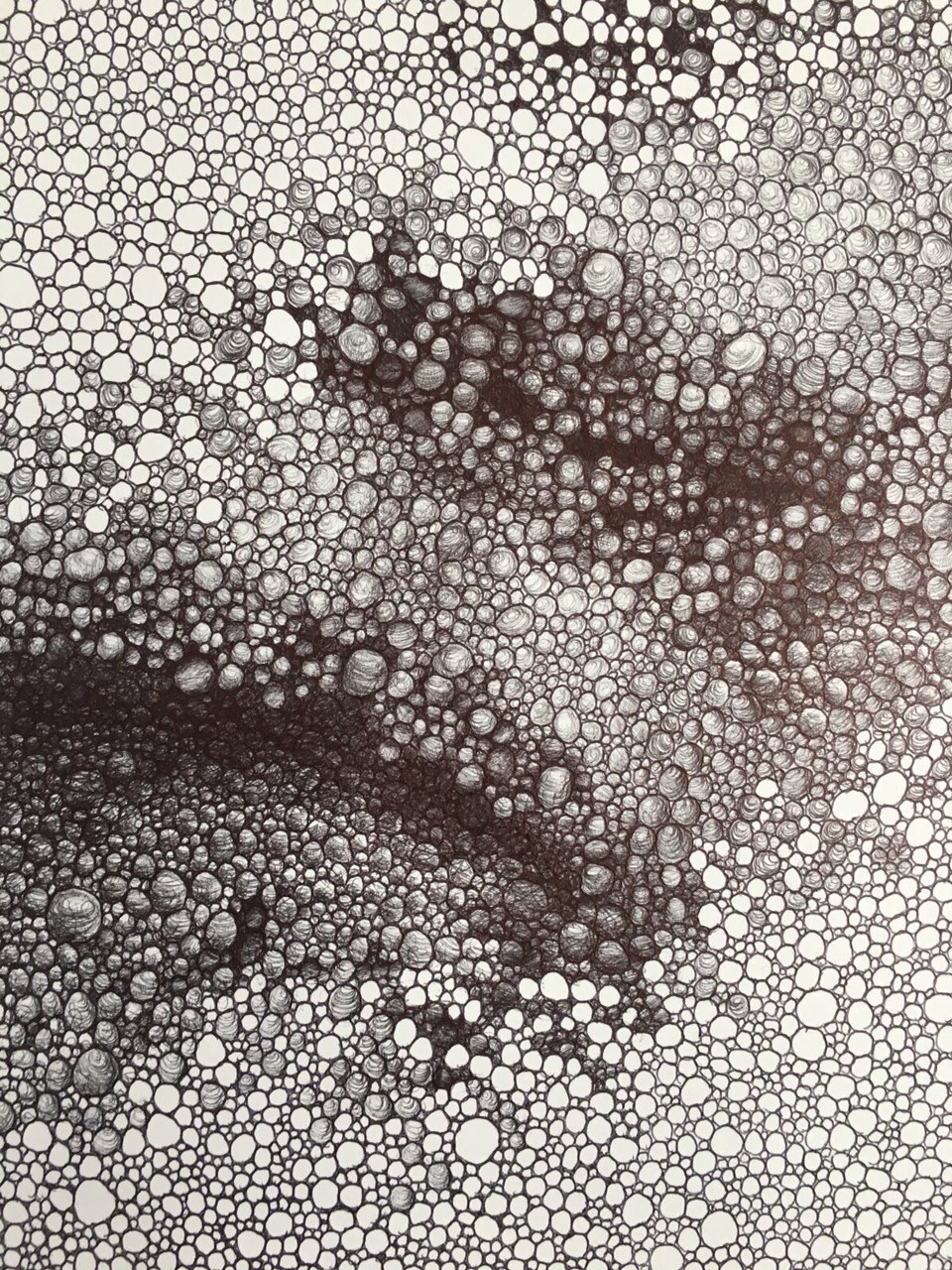 Seine Bilder sind vielfach mit schwarz-weiss Strukturen bis ins kleinste Detail faszinierend ausgearbeitet, oft umgesetzt mit Kugelschreiber und Tusche.