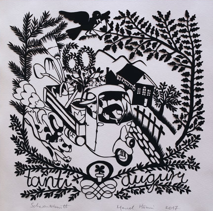 Marcel Hänni bedient sich der Technik des traditionellen Scheren-Schnitts, aber gestaltet mit seinen Motiven und unkonventionellen Faltungen neue Interpretationen. Er stellt sich der grafischen Herausforderung, nur mittels schwarz-weiss Welten zu erschaffen, die räumliche Tiefe erzeugen. Die Scherenschnitte sind eine Gegenwelt zu seinen sonst farbigen Oelbildern.