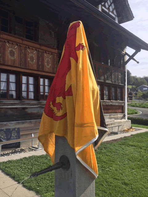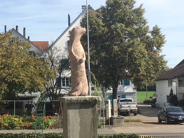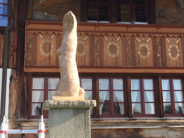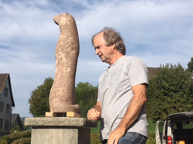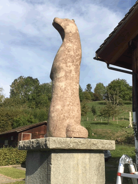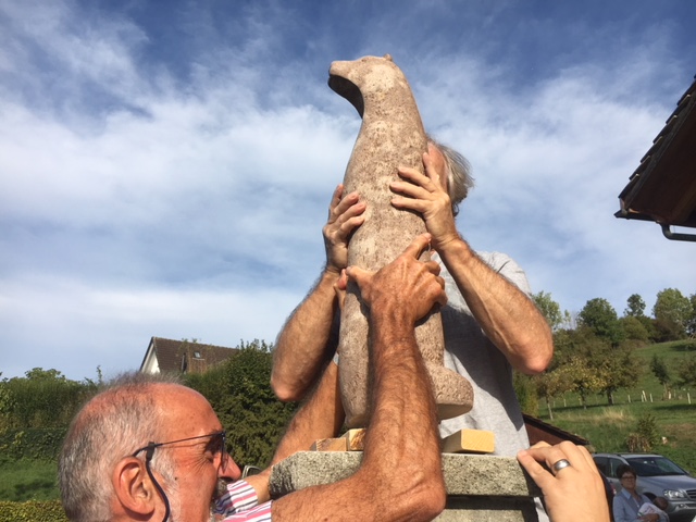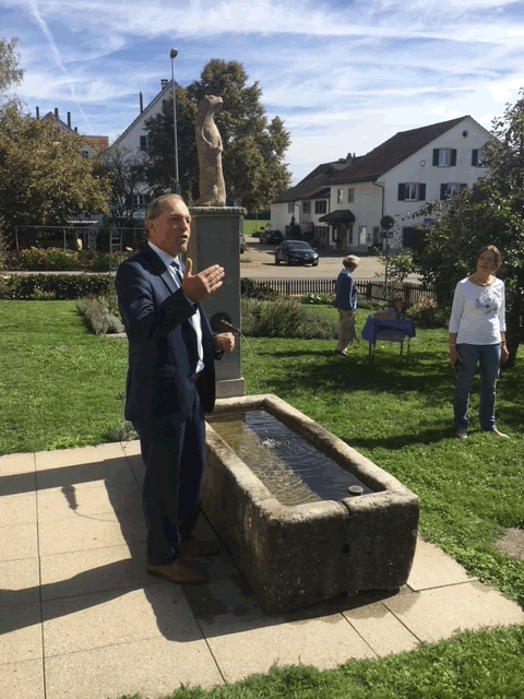 Am 22. September 2018 wurde der Brunnen vor dem Dürstelerhaus mit dem stolzen Tier geschmückt. Bildhauer meiser Heini Albrecht aus Rüti hat das imposante Werk aus einem roten Sandstein aus Santa Fiora (Toscana) geschaffen. Anlässlich einer kleinen Feier wurde das Kunstwerk enthüllt.